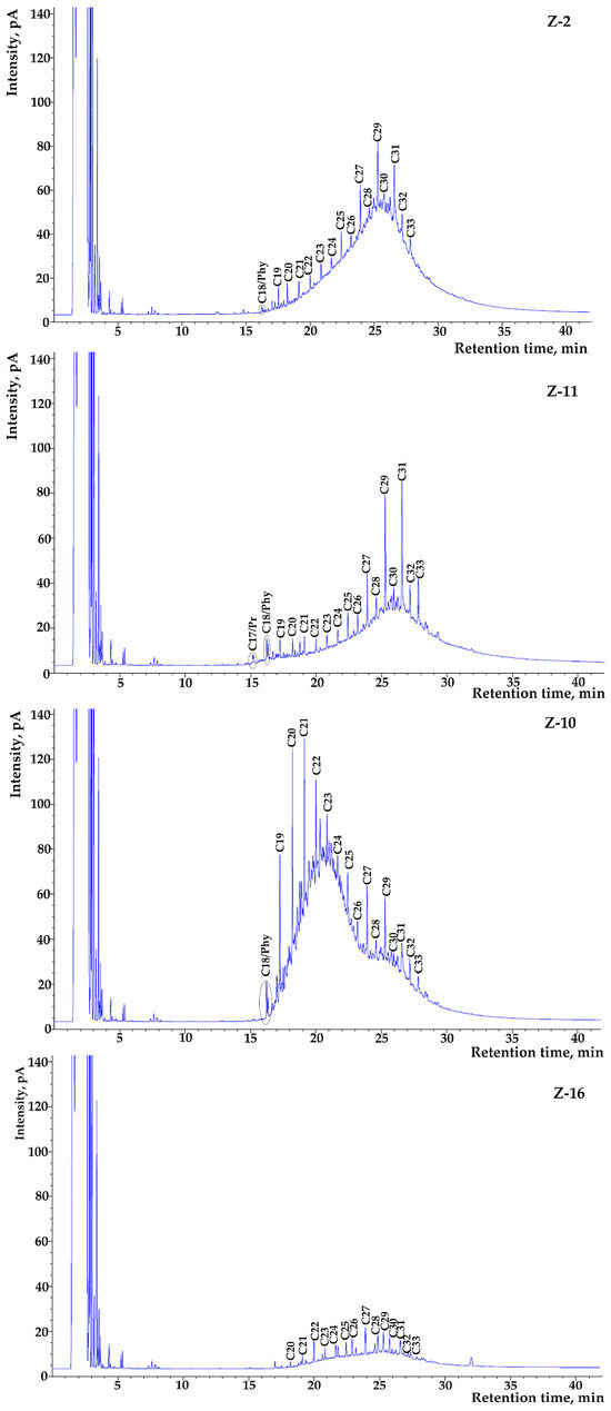 The U/R ratio values range from 0.18 to 6.51 (Table 2). The samples Z-2, Z-3, and Z-9 have U/R values ≥ 4 (Table 2), indicating a high content of biodegraded petroleum-derived substances in these samples. These results indicate some earlier petroleum inputs into the related soil. Relatively low values of UCM for some samples may suggest recent inputs of the petroleum pollutants [38], as is the case with soils Z-5, Z-6, Z-11, and Z-12.