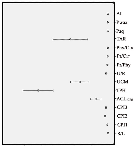 The box and whisker plot analysis were used to represent the profiles of the variables of the soil samples, as shown in Figure 3. Parameters such as the TPH, UCM, TAR, and ACL indices exhibited a broad range as indicated by the high standard deviation values for these parameters.