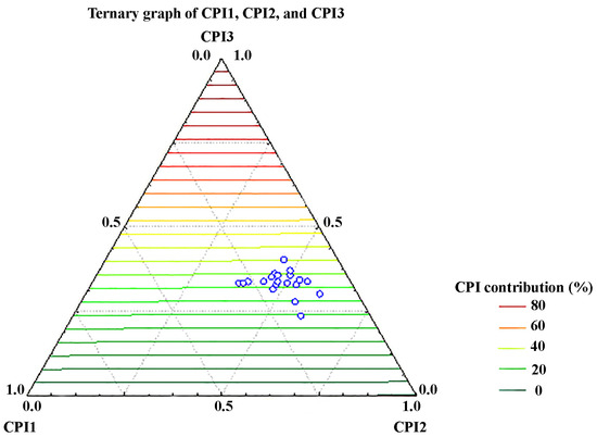 Ternary diagram showing relative abundance of the carbon preference indices: short-chain alkane homologs, CPI1, mid-chain n-alkanes, CPI2, and all n-alkanes homologs (CPI3) of investigated soil samples.
