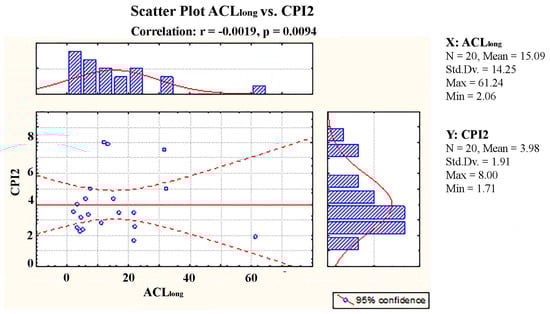 Using the odd carbon numbers of the higher plants n-alkanes as a basis, the average chain length (ACL) and alkane index (AI) are two additional tools that are also used for the identification of the source of n-alkanes in the environment [48]. The range of ACL values for the soil samples investigated in this study was found to be between 2.06 and 61.24. Furthermore, in addition to the major n-alkane contributors previously mentioned in the text, it is probable that the anthropogenic hydrocarbon input is the underlying cause for the low ACL values. Since n-alkanes are used to calculate both CPI and ACL, a significant positive correlation between ACLlong and terrestrial higher plant n-alkanes should be expected if higher plants were the only source of n-alkanes in the samples investigated. However, since the samples were contributed with hydrocarbons from various sources, no notable correlation was found between ACLlong and CPI2 (n-C24-33) (Figure 5).