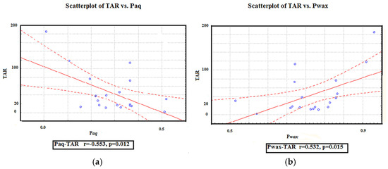 The TAR values were calculated to identify possible shifts in the relative contributions of OM, from the aquatic and terrestrial vegetation to the soil environment. The TAR ratio values are very variable (Figure 3), reflecting changes in the relative contributions of aquatic and terrestrial plant-derived organic matter across the sampling area. The ratios of TAR are in the range from 1.31 (Z-10) to 185.11 (Z-9). According to these results, it can be concluded that the terrigenous input to the OM of the samples investigated is predominant, as it can be seen from the negative relationship between TAR and Paq. As expected, TAR is considerably positively correlated with Pwax (Figure 6).