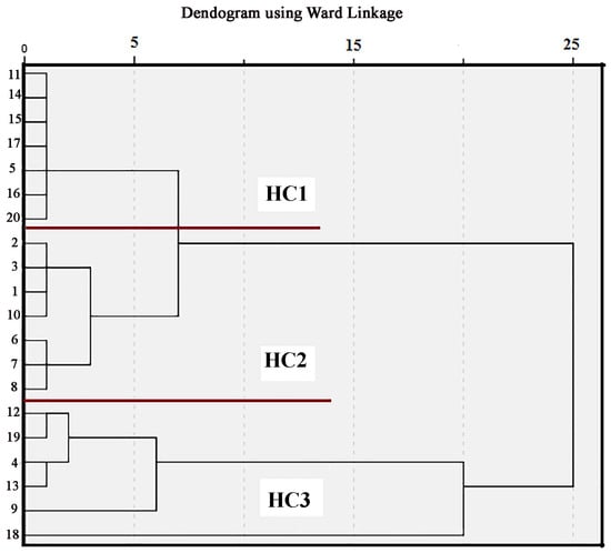 Statistical treatment was applied by using the parameters shown in Table 2. The first exploratory method included application of hierarchical cluster analysis (HCA) on the log-transformed data from 20 sampling locations. Spatial HCA found matching monitoring locations and created a dendrogram, clustering all samples into distinct groups. Under squared Euclidean, HCA was applied to the dataset using the Ward method. Three distinct clusters of soil samples have been identified from the results of the Q-mode hierarchical cluster analysis, based on the extent of grouping (Figure 7). Seven samples make the Group HC1 (Z-5, Z-11, Z-14, Z-15, Z-16, Z-17, and Z-20); Group HC2 also consists of seven samples (Z-1, Z-2, Z-3, Z-6, Z-7, Z-8, and Z-10); and group HC3 consists of six samples (Z-4, Z-9, Z-12, Z-13, Z-18 and Z-19). These results confirm that different plants, along with human-made inputs, influenced the composition of the soil organic matter in the investigated location.