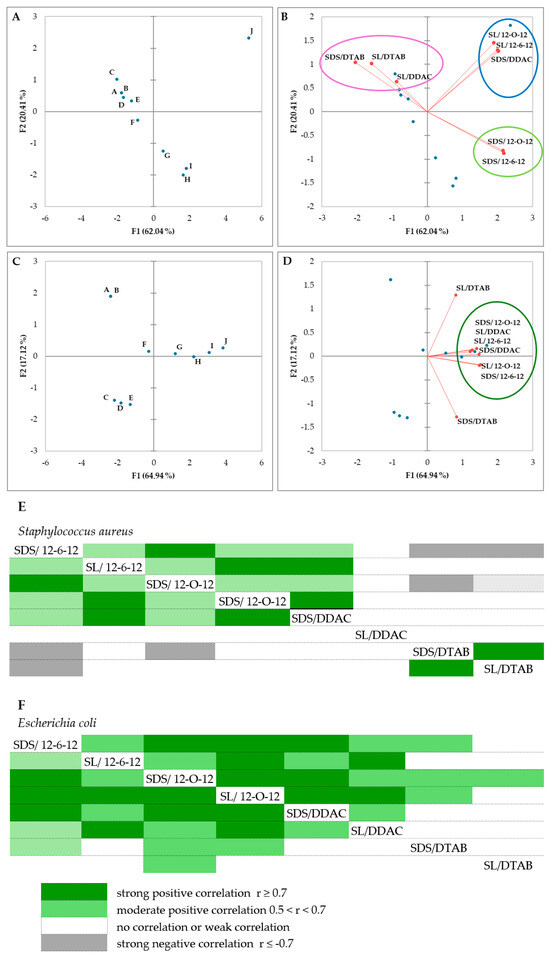 Principal component analysis for the minimum inhibitory concentrations (MICs) of eight substances in ten variants for Staphylococcus aureus (A,B) and Escherichia coli (C,D). Circles for subfigures (B,D) show groupings of compounds with similar relationships. Composition variants are shown as blue dots, while substances as red lines with red dots. (E,F) Correlation matrix for mixtures of surfactants (MICs) for Staphylococcus aureus and Escherichia coli, respectively.
