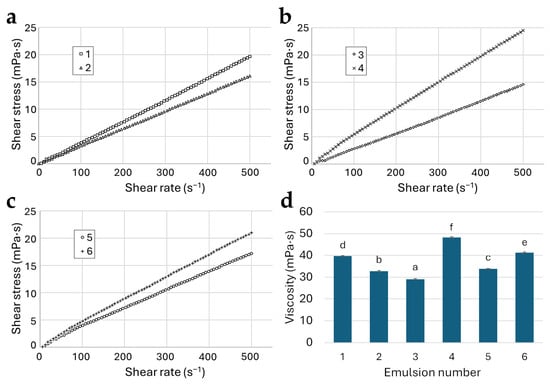 Flow curves (a–c) and viscosity (d) of linseed oil emulsions prepared with maltodextrin (1,2), nutriose (3,4), and inulin (5,6) using micro- (1,3,5) and nanoemulsification (2,4,6), plotted with shear stress over shear rate. a–f bars (mean ± standard deviation) in subfigure d marked with different letters indicate significant differences (p < 0.05).