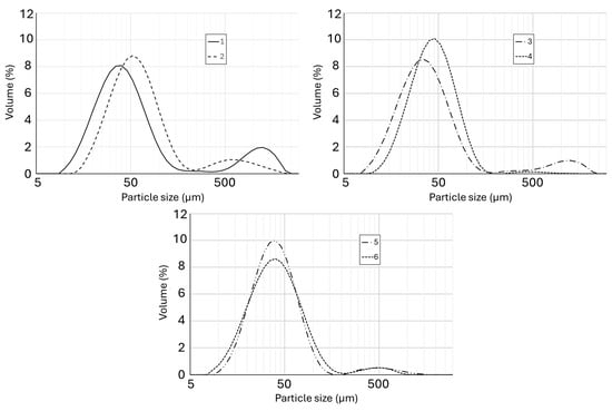 Particle size distribution (by volume) of powders from linseed oil emulsions prepared with maltodextrin (1,2), nutriose (3,4), and inulin (5,6) using micro- (1,3,5) and nanoemulsification (2,4,6).