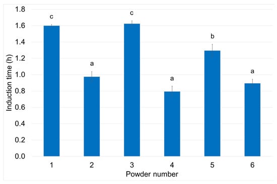 Oxidative stability (expressed as induction time at 110 °C) of powders from linseed oil emulsions prepared with maltodextrin (1,2), nutriose (3,4), and inulin (5,6) using micro- (1,3,5) and nanoemulsification (2,4,6). Different letters indicate significant differences (p < 0.05).