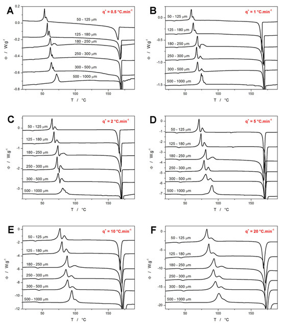 (A–F) DSC curves obtained for differently sized NIF powders at heating rates q+ = 0.5–20 °C·min−1. Exothermic effects evolve in the upwards direction. The DSC curves were shifted along the Y axis to enhance the clarity.