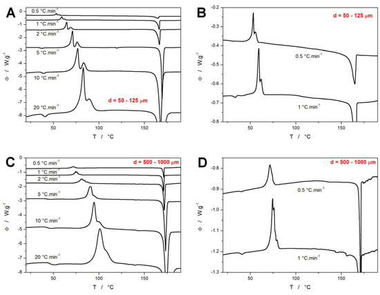 (A–D) DSC curves obtained for the 50–125 μm and 500–1000 μm NIF powders at heating rates q+ = 0.5–20 °C·min−1. Graphs (B,D) are zoomed in on the crystallization peaks measured at the lowest q+. Exothermic effects evolve in the upwards direction. The DSC curves were shifted along the Y axis to enhance the clarity.