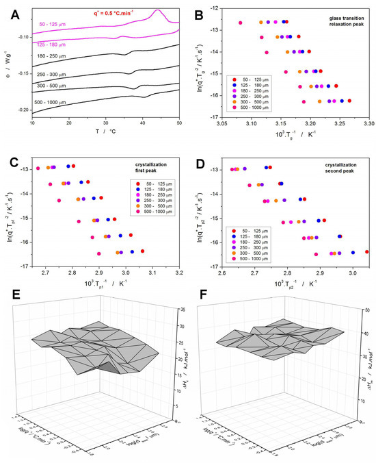 Apart from the determination of the activation energy (which will be discussed in Section 4), the Kissinger plots can very effectively assess the temperature shifts in the monitored processes with various experimental conditions. This is particularly important in the case of the glass transition data, as shown in Figure 3B. Theoretically, Tg could be expected to be invariant with powder particle size due to the manifestation of the relaxation motions only on a molecular level. This would imply that the shifts depicted in Figure 3B are related to the thermal gradients being present on the path from within the sample to the DSC sensor. However, such gradients would primarily manifest themselves as curvatures/shifts to higher T at higher q+, and their effect would cease for the data measured at q+ = 0.5 °C·min−1 [50]. Since no such effect is observed in Figure 3B, the increase of Tg with daver is indeed a consequence of the relaxation processes being sped up by the presence of volume mechanical defects or (more probably) by the internal stress induced either by the melt-quench or by the gentle grinding of the amorphous NIF matter (note a similar manifestation in case of amorphous indomethacin [46]). Note that the Raman microscopy checks did not detect any traces of the crystalline phase in any of the as-prepared NIF powders, which rules out the potential influence of initial crystallinity (driven by particle size) on the shift of Tg. Whereas the stress/quench-induced temperature shift of Tg exhibits a monotonous trend with increasing daver, the same cannot be stated about the crystallization peaks. The borderline powder sizes (50–125 μm, 125–180 μm, and 500–1000 μm) verify the fundamental idea of the crystal growth being accelerated in the presence of mechanical defects. However, the middle-sized powders, which do not have a very large amount of mechanical defects nor are they free of them, show variability and inconsistency with the expected monotonous increase in the crystallization characteristic temperatures (Tons, Tp1, and Tp2) with rising daver. This unambiguously indicates that the intensity of the crystal growth induced by the presence of mechanical defects is comparable to that associated with the variable number of primary nuclei originating from the melt-quench process. Since, similar repeated preparations of the amorphous powders were recently performed for other low-molecular organic glasses (indomethacin [46], griseofulvin [51], nimesulide [52]), based on this experience, NIF seems to be most prone to the slight changes in the melt-quench procedure, which consequently affect its tendency to form the crystalline phase.