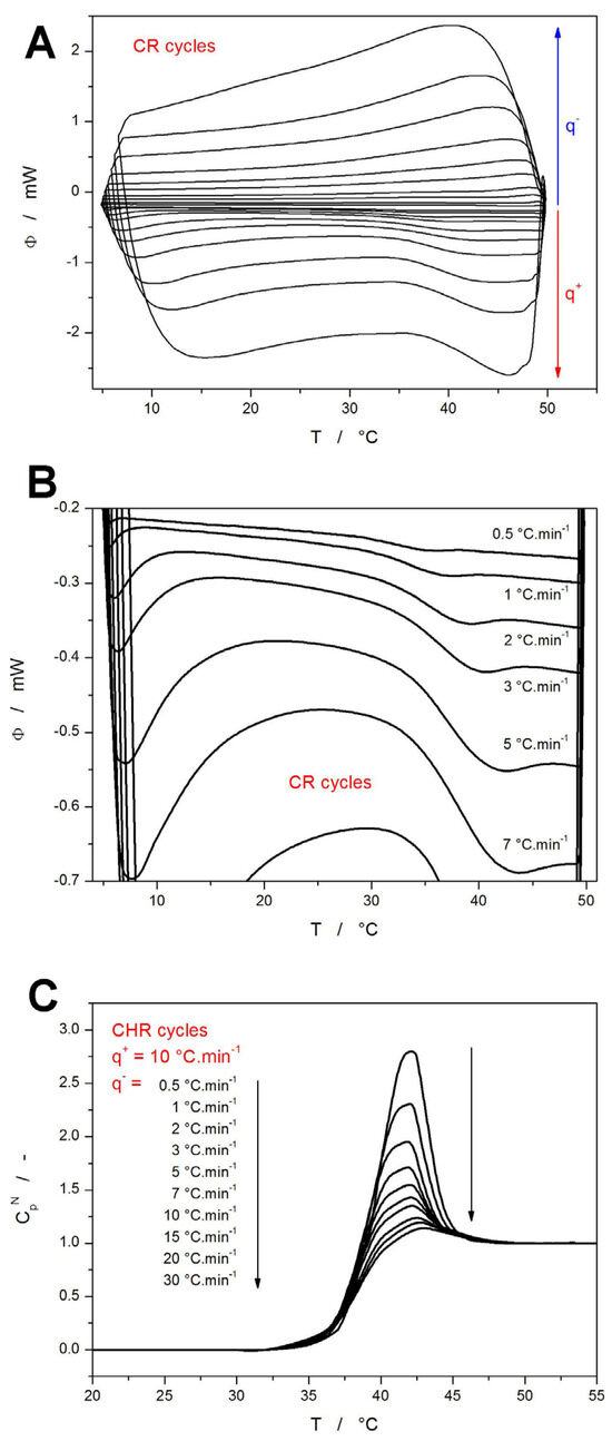 where q− is the cooling rate used in the step preceding the heating scan from which the Tgp is determined. This type of evaluation is shown in Figure 6A, where the very good linearity of the depicted dependence indicates an absence of any potential thermal gradients within the system. An alternative method for the determination of Δh* was introduced by Moynihan [58], which is based on the evaluation of Tf from the CHR cycles by the “equal areas method” (explained in Supplementary Materials):