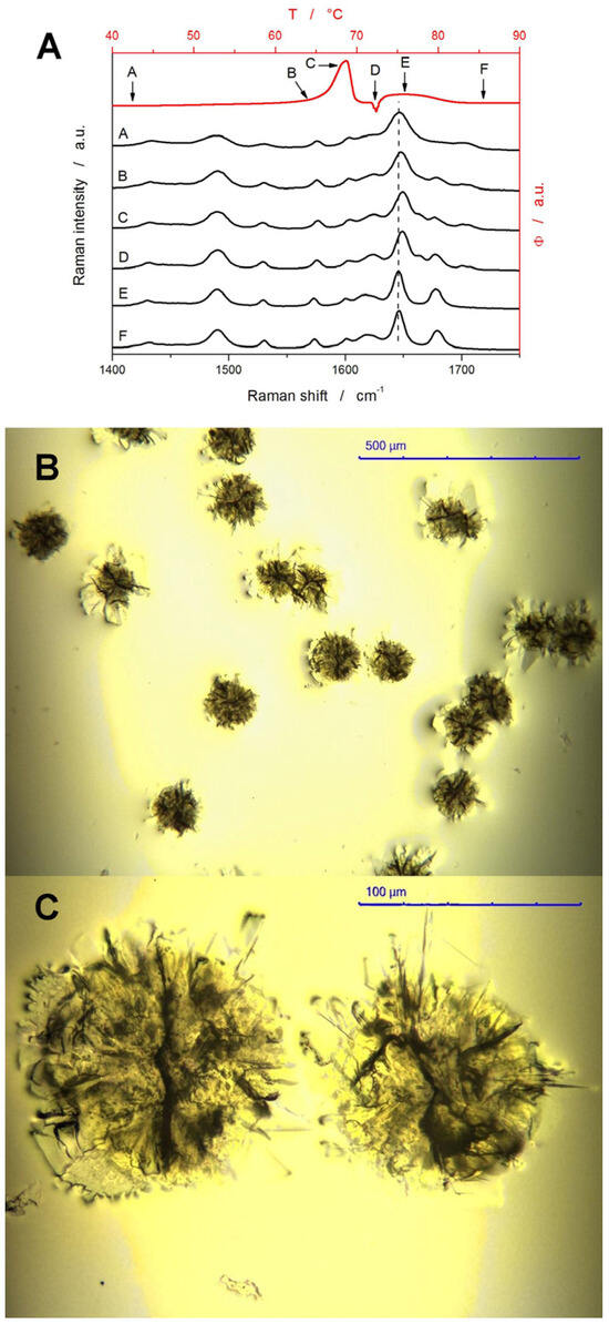 (A) DSC curve measured for the amorphous 180–250 μm NIF powder at 1 °C·min−1 (red data; top and right axes), where the letters A–F denote specific positions (defined by the corresponding temperatures) on the DSC curve. The Raman spectra then correspond to these characteristic events (as denoted by the arrows and letters) on the DSC curve (black data; bottom and left axes). (B,C) Optical micrographs of NIF crystals grown at high q+.