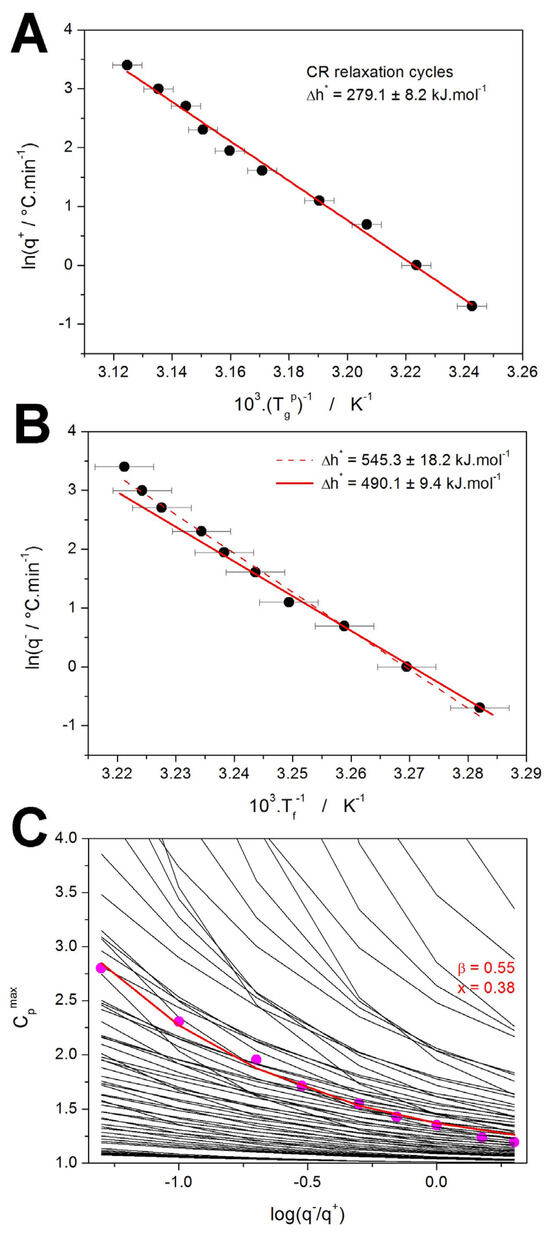 The first quantity to determine is usually the activation energy of structural relaxation Δh*. A standard method for this task is based on the evaluation from the CR cycles, which can be expressed by Equaton (6) [50,57]: