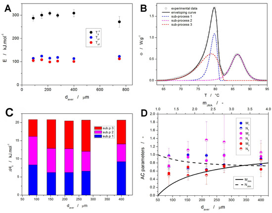 (A) Activation energies calculated for the three characteristic temperatures based on the Kissinger plots (Figure 3B–D). (B) An example of the NIF crystallization DSC curve (125–180 μm at 10 °C·min−1) deconvoluted by means of the sc-MKA method. (C) Crystallization enthalpies obtained via sc-MKA method for the NIF powders (the data are averaged over all q+). (D) AC kinetic parameters obtained via sc-MKA method for the DSC crystallization data of the NIF powders (the data are averaged over all q+). The lines (scaled according to the top axis) indicate the fingerprint M + N combinations attributed to the various values of the kinetic exponent of the JMA model.