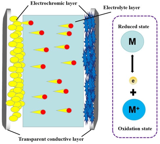 Electrochromic devices are usually constructed with two transparent conductive layers (electrode layers); sandwiched between them are the electrochromic layer and electrolyte layer Figure 1) [30]. The electrochromic layer is the core layer of the electrochromic device and is also the layer where the color change reaction occurs. When the voltage is applied to the transparent conductive film, the positive and negative ions in the electrolyte film will migrate to the color-changing layer and react with the electrochromic material in the color-changing layer to become colored compounds so that the electrochromic device will show color. When the electrode polarity is opposite, the ion migration direction is opposite, and the electrochromic device is restored to its original state [31]. The electrolyte layer is a channel for ion migration. Under the action of the external electric field, the ions in the electrolyte layer can be migrated, which is an essential part of the electrochromic device to realize the color-changing function [32]. The working principle of the electrochromic material with the chemical reaction can be expressed as “M (reduced state) → M+ (Oxidation state)+e”, which works in the same way as the energy storage mechanism of electrode materials for pseudocapacitors (Figure 1) [33]. The electrochromic material displays different colors in the oxidized and reduced states respectively. The combination of UV-Vis spectroscopy and electrochemistry is an important means of studying the electrochromic properties of conductive polymer films. For an ideal electrochromic material, it should have both a large transmittance and a small electrical variation. Contrast, coloring efficiency, response time of color development, and optical memory are important parameters for evaluating an electrochromic material [34]. At present, electrochromic devices have shown broad application prospects in the fields of smart windows, self-powered batteries, and solar panels because of their unique optical properties [35].