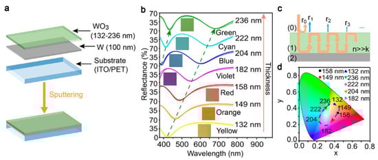 (a) Schematic diagram of the structure for the F-P cavity-type ESD electrode; (b) Simulated and measured reflection spectra and the optical images of the electrodes with different thicknesses of WO3; (c) Schematic diagrams of light wave reflection processes of the ESD electrodes; (d) CIE 1931 color coordinates of the F-P cavity-type ESD electrodes with different thicknesses of the WO3 layer [49]. Copyright 2020, American Chemical Society.