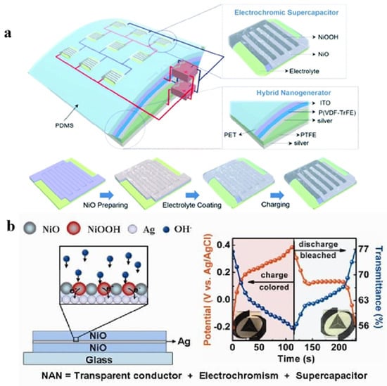 (a) Schematic illustration of the flexible and smart self-charging power package [54]. Copyright 2018, Wiley Online Library. (b) The structure of transparent ITO-free NiO-Ag-NiO electrode and in situ transmittance and chronocoulometry switching curves with color changes [55]. Copyright 2017, Royal Society of Chemistry.