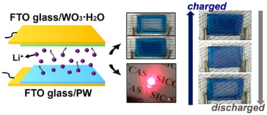 Prussian blue appears white in its reducing state, also known as Prussian white (PW). Li’s group developed a novel electrochromic energy storage device composed by WO3·H2O nanosheets and PW film [73]. This device has a wide optical modulation capability, ultra-fast response time, excellent coloring efficiency and long cycle life. In addition, an enlarged electrochromic energy storage device was built as a prototype to visually monitor the stored energy level through color changes (Figure 5).