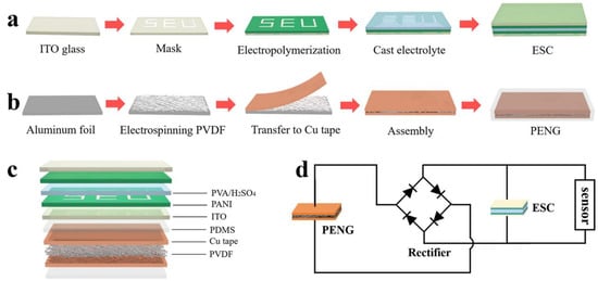 (a) Fabrication process of the ESD; (b) Preparation process of the piezoelectric nanogenerators; (c) Schematic depiction of the self-powered patterned ESD; (d) Equivalent circuit of the ESD [79]. Copyright 2018, American Chemical Society.