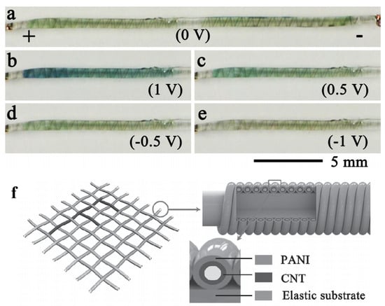 (a–e) Chromatic transitions during the charge–discharge process under different potentials. (f) Schematic illustration of the structure of the fiber-shaped electrochromic supercapacitor [80]. Copyright 2014, Wiley Online Library.