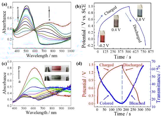 - Guo, Q.; Zhao, X.; Li, Z.; Wang, B.; Wang, D.; Nie, G. High performance multicolor intelligent supercapacitor and its quantitative monitoring of energy storage level by electrochromic parameters. ACS Appl. Energy Mater. 2020, 3, 2727–2736. [Google Scholar] [CrossRef]