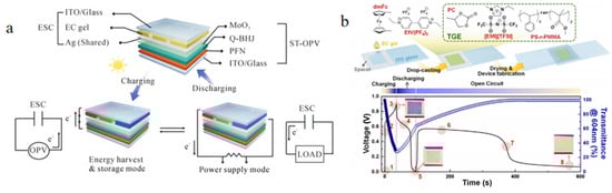 (a) ST-OPVs monolithically integrated with ESC based on viologen derivatives [84]. Copyright 2020, Wiley Online Library. (b) Schematic of the fabrication process of ternary gel electrolyte-based ESD, the GCD curves, and the corresponding transmittance profile [85]. Copyright 2021, Elsevier.
