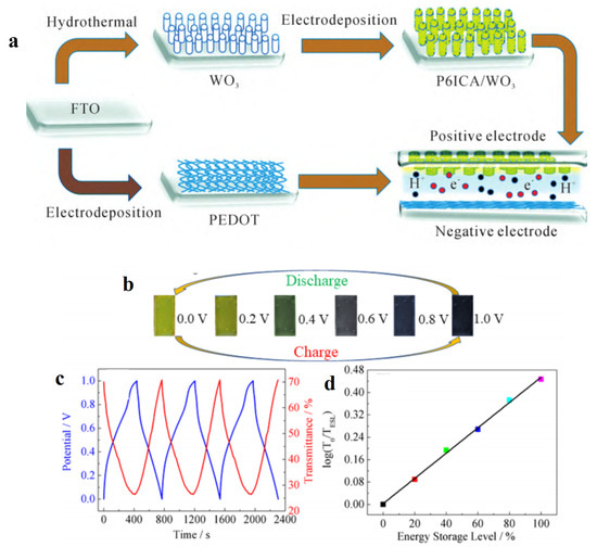 - Bi, Z.; Li, X.; Chen, Y.; He, X.; Xu, X.; Gao, X. Large-scale multifunctional electrochromic-energy storage device based on tungsten trioxide monohydrate nanosheets and prussian white. ACS Appl. Mater. Interfaces 2017, 9, 29872–29880. [Google Scholar] [CrossRef]