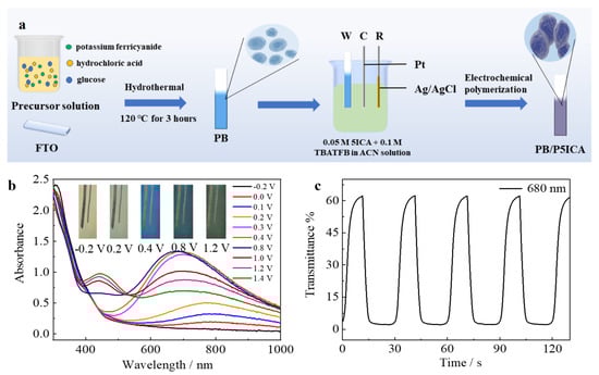 (a) The synthesis procedure of PB/P5ICA; (b) The color change under different potentials of PB/P5ICA; (c) The transmittance curve of the PB/P5ICA [67]. Copyright 2022, Elsevier.