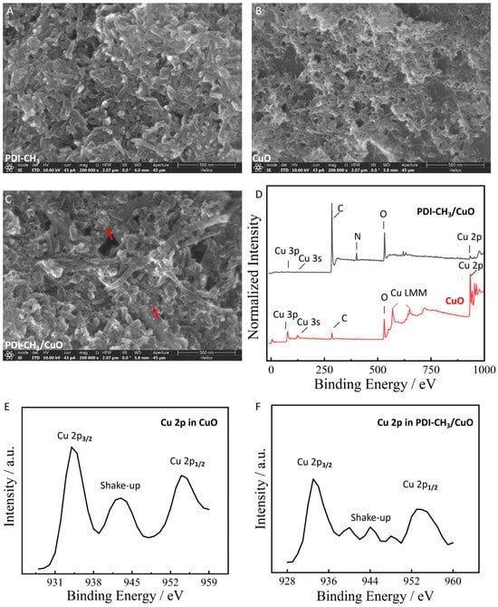 The SEM image of PDI-CH3 (A), CuO (B) and PDI-CH3/CuO (C). (D) The XPS of CuO (red line) and PDI-CH3/CuO (black line). The XPS spectra of Cu 2p in CuO (E) and the Cu 2p in PDI-CH3/CuO (F).