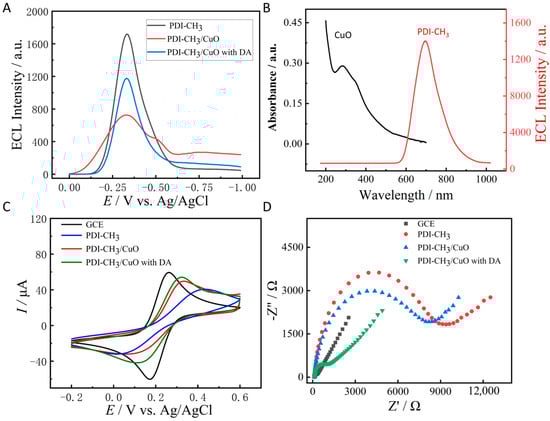 (A) The ECL intensity of PDI-CH3-modified GCE (black line), PDI-CH3/CuO-modified GCE (red line) and PDI-CH3/CuO-modified GCE treated with DA (blue line) recorded in 0.1 M PBS (pH 7.0) with 0.1 M K2S2O8 during the potential scanning range from 0 to −1.0 V. (B) The UV–Vis spectra of CuO solution (black line) and the ECL spectra of PDI-CH3-modified GCE recorded in 0.1 M PBS (pH 7.4) with 0.1 M K2S2O8 during the potential scanning range from 0 to −1.0 V (red line). The CV (C) and EIS (D) of bare GCE (black line), PDI-CH3-modified GCE (red line), PDI-CH3/CuO-modified GCE (blue line) and PDI-CH3/CuO-modified GCE treated with DA (green line) performed in 0.1 M Na2SO4 (pH 6.0) with 5 mM K3Fe[CN]6/K4Fe[CN]6.