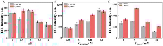 To construct an optimized biosensor, the pH of the electrolyte solution and the concentration of Cu2+ and K2S2O8(CCu2+ and CK2S2O8) for preparing biosensors were optimized (Figure 5). When the CCu2+ was at 2 mM and CK2S2O8 was at 0.1 M, the pH from 6.0 to 8.0 was investigated (Figure 5A). The difference in the ECL intensity of the biosensor between 0 µM DA and 1 µM DA was the largest for pH at 6.5. Thus, 6.5 was taken as the optimized pH. When the pH was at 6.5 and CCu2+ was at 2 mM, CK2S2O8 from 0.05 to 0.2 M was tested (Figure 5B). The difference in the ECL intensity of the biosensor between 0 µM DA and 1 µM DA was the largest for CK2S2O8 at 0.15 M. When pH was at 6.5 and CK2S2O8 was at 0.15 M, the difference in the ECL intensity of the biosensor between 0 nM DA and 1 nM DA was the largest for CCu2+ at 5 mM (Figure 5C).