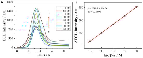 (A) The ECL intensity of biosensors at different CDA: 0 (a), 10−13 (b), 10−12 (c), 10−11 (d), 10−10 (e), 10−9 (f), 10−8 (g) and 10−7 (h) M. (B) The relationship between the difference in ECL intensity and lgCDA. The number of measurement repetitions at each concentration was three and the RSD% was from 1.5% to 9.9%.
