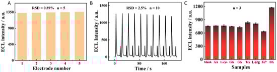 (A) The ECL intensity of five parallel DA sensors with CDA 1 nM. (B) The ECL intensity of DA sensor for ten continuous cycles. (C) The ECL intensity of DA sensor for blank, AA, L-cys, Glu, Gly, Try, L-arg, Fe3+ (10 nM) and 0.1 nM DA. The number of measurement repetitions for every interference was three and the RSD% was from 0.27% to 2.6%.