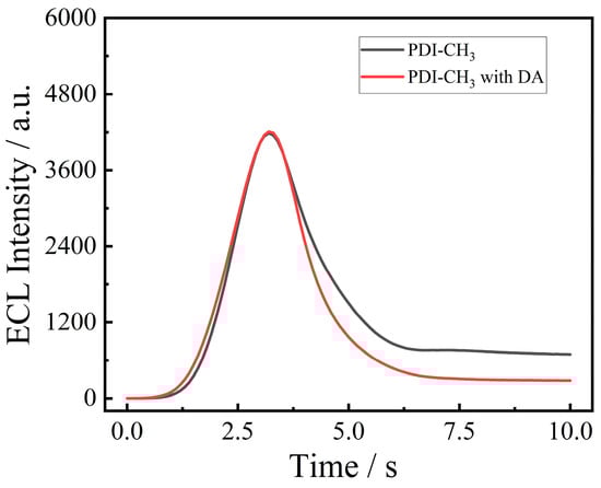 The ECL curves of PDI-CH3-modified GCE before (black line) and after (red line) treatment with DA recorded in 0.1 M PBS buffer (pH 6.5) containing 0.15 M K2S2O8. The cycle scanning potential was from 0 to −1.0 V at a scan rate of 0.1 V/s.