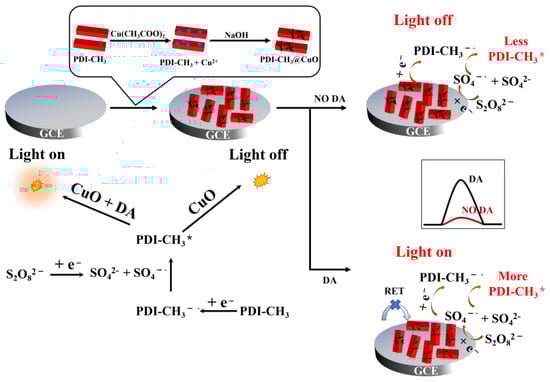 The ECL detection mechanism for DA based on PDI-CH3/CuO nanosmaterials.