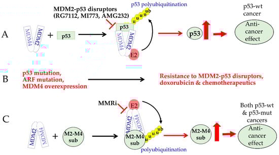 Advantages of targeting RING domain functions of MDM2-MDM4 in anti-cancer drug development. (A) Mechanisms of MDM2-p53 disruptor inhibitors and their anti-cancer effect in p53-wt cancers. (B) Components of the p53 pathway mutations or MDM4 overexpression confer resistance to MDM2-p53 disruptors and other chemotherapies in cancer. (C) Targeting the RING domain activity of MDM2-MDM4 by MMRi induces anti-cancer effect in both p53-wt and p53-mutant cancers.