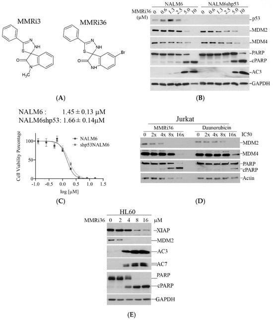 The primary hit MMRi3 is a thiadiazole identified in an enzyme-based HTS for inhibition toward the MDM2-MDM4 RING-domain-mediated E3 ligase reaction []. To find an E3 ligase inhibitor of the MDM2-MDM4 complex with p53-independent pro-apoptotic activity, we decided to use an apoptosis assay and p53-mutant cells to screen the available MMRi3 analogs from Hit2Lead library. This effort led to the identification of MMRi36. Interestingly, distinct from primary hit MMRi3 that inhibits the E3 ubiquitin ligase activity of MDM2-MDM4, MMRi36 stimulates the E3 ubiquitin ligase activity of MDM2-MDM4 in in vitro ubiquitination assays and promotes degradation of MDM2/MDM4 and p53 in cells []. The structures of MMRi3 and MMRi36 are shown in Figure 2A. To confirm that MMRi36-induced apoptosis is indeed p53-independent, we generated p53 knockdown leukemic cell line NALM6shp53 for testing. Our results from Western blotting analysis suggested that MMRi36 effectively induced an apoptosis response in both NALM6 and NALM6shp53 lines indicated by caspase 3 activation and PARP cleavage (AC3 and cPARP in Figure 2B). This apoptosis was associated with downregulation of MDM2, MDM4, and p53 proteins at the time when apoptosis was induced, consistent with the expected effect of MMRi36 as an activator of the MDM2-MDM4 E3 ligase complex. To confirm the effect of p53 status on MMRi36 sensitivity, we performed anti-proliferation assays with MMRi36 in these matched cell lines and found that the growth curves of the two cell lines in the presence of MMRi36 were nearly overlapped, with similar IC50s (Figure 2C, 1.45, and 1.66 μM respectively). To ask whether MMRi36 is a more potent apoptosis inducer than daunorubicin, the first line treatment for leukemia, we treated Jurkat cells with different equal effect doses (×IC50) for 24 h and looked at cleaved PARP induction. Our results indicated that comparable level of cleaved PARP was induced by 4× IC50 dose of MMRi36 but 16× IC50 dose of daunorubicin (Figure 2D). Further comparison in more cell lines including leukemic CCRF-CEM, MV4-11, and p53-mutant lymphoma RAMOS cells reached the same conclusion that MMR36 induces significant apoptosis at 8× IC50, while daunorubicin at 16× IC50 failed to do so or only induced little apoptosis (S1). Using p53-null HL60 cells, we found that MMRi36-induced apoptotic PARP cleavage was accompanied with downregulation of MDM2, XIAP, and activation of caspase 3 and caspase 7 (Figure 2E). Taken together, these results suggest that MMRi36 has good pro-apoptotic activity in leukemic cells, regardless of p53 status.