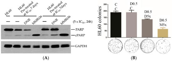 Pro-apoptotic activity of MMRi36 was not affected by daunorubicin resistance mechanisms. (A) HL60 cells pre-exposed to daunorubicin at IC50 (4.41 nM) or IC75 (12.77 nM) for one week. Then, the cells were replated and treated with 5× IC50 of either daunorubicin (22.05 nM) or MMRi36 (5.05 μM) for 24 h followed by WB for PARP cleavage. (B) HL60 cells pre-exposed to IC50 dose (D0.5) of daunorubicin as in (A), then were replated and treated with 5× IC50 of either daunorubicin (22.05 nM, D5x) or MMRi36 (M5x) for 12 h and then used in soft agar assays. Upper, histograms of the colony numbers of the indicated samples. Lower, images of colonies grown for 14 days in soft agar plates.