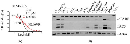 To know whether MMRi36 also has anti-leukemic activity in cells with acquired drug resistance, we tested it in the HL60-vincristine-resistant cell line (HL60VR), which was established by exposure of HL60 cells to increasing concentrations of vincristine over a long period of time []. HL60VR cells have a phenotype of resistance to apoptosis due to BCL-2 overexpression []. Compared to parental HL60 cells, the HL60VR cell line is 516-fold resistant to vincristine and 47-fold resistant to daunorubicin []. However, HL60VR and HL60 cells showed similar sensitivity to MMRi36 with IC50 of 1.01 and 1.46 μM (Figure 4A).