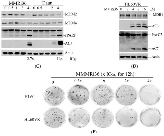 MMRi36 remains active in HL60VR cells with acquired drug resistance by potent apoptosis induction. (A) Growth curves and IC50s of parental HL60 and vincristine-resistant HL60 (HL60VR) in the presence of increasing concentrations of MMRi36. (B) Apoptotic response in HL60VR cells by different drugs. The cells were treated with vincristine at 333-fold IC50 in HL60 cells and other indicated drugs at 5× IC50 concentrations in HL60 cells for 24 h. Apoptosis induction was shown by PARP cleavage and activation of caspase 3 (AC3). (C) Comparison of apoptosis induction potency between MMRi36 and daunorubicin at equal concentrations for 24 h in HL60VR cells. (D) Effect of MMRi36 on MDR1 expression during apoptosis induction in HL60VR treated at the indicated concentrations for 24 h. (E) MMRi36 has comparable effects in 2D and 3D culture systems for both HL60 and HL60VR cells. Cells were treated with indicated concentration of MMRi36 for 12 h. Then, colonies were grown for 14 days. Colonies were stained with methylene blue solution and air-dried for imaging.