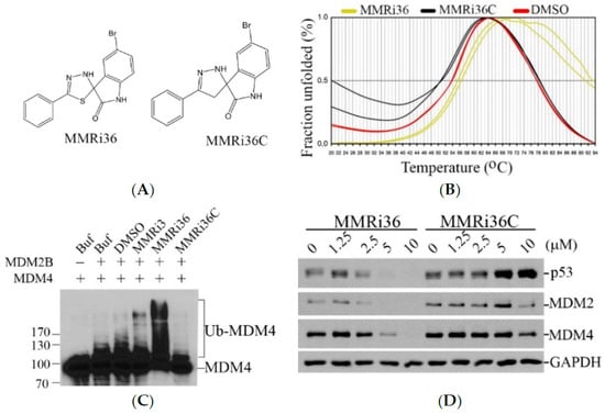 MMRi36C dissociated RING-RING interaction and acted as an inhibitor of MDM2 E3 ligase activity. (A) Chemical structure of MMRi36 and MMRi36C. (B) Thermofluor results of MMRi36 vs. MMRi36C using purified MDM2-MDM4-RING domain protein heterodimers. (C) In vitro ubiquitin E3 ligase assay using recombinant MDM4 and MDM2B protein in the presence of 10 μM indicated compounds. (D) MMRi36C was a more potent inducer of p53 protein accumulation than MMRi36. WB analysis of p53 in NALM6 cells treated with the indicated compound at the indicated concentrations for 24 h. GAPDH served as the loading control.