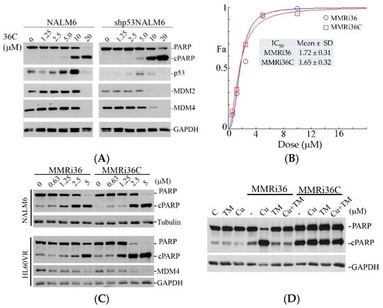 MMRi36C induced p53-independent apoptosis in leukemic cells. (A) WB analysis of p53, MDM2, MDM4, and cleaved PARP (cPARP) in NALM6 and shp53NALM6 cells after treatment with MMRi36C at the indicated concentrations for 24 h. (B) Growth inhibition curves of HL60VR cells treated with MMRi36 or MMRi36C. Date are representative of three independent experiments analyzed by the Chou–Talalay method with CompuSyn software. IC50s and standard deviation (SD) are shown. Fa, affected fraction. (C) WB analysis of cleaved PARP (cPARP) in NALM6 and HL60VR cells after treatment with MMRi36 and MMRi36C at the indicated concentrations for 24 h. (D) The pro-apoptotic activity of MMRi36 but not MMRi36C is affected by the copper ion. WB analysis of PARP and GAPDH in HL60VR cells treated with MMRi36 or MMRi36C with or without 2 μM copper (II) sulphate or copper (II) chelator TM for 24 h. GAPDH served as the loading control.