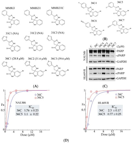 The pyrazole derivatives investigated in this study (Figure 7) were synthesized and characterized in house, analogous to the reported methods [,,,,]. They were dissolved in DMSO as 10 mM stock solutions for use in cell treatment. MMRi36 and MMRi31 were synthesized as previously reported []. MMRi31C was synthesized as previously reported []. MMRi3 was synthesized as previously reported []. Analogs 31C2 and 31C3 were synthesized as previously reported []. Novel derivatives 31C1-3 and 36C1-7 were synthesized via a three-step condensation of the respective acyl arene with the respective isatin and hydrazine in analogy to 31C2 and 31C3 []. The purity of each analog compound that was subjected to cellular and biochemical assays was assessed by each compound’s 1H NMR spectra, acquired at 400 MHz []. Details of chemical synthesis and compound characterization by mass spectrometry are provided in the Supplemental Information (S2).