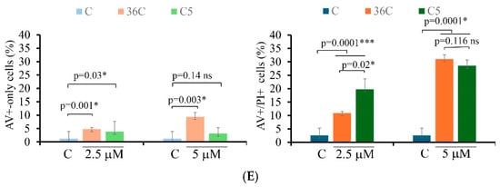 Annexin-V staining kit (ThermoFisher Scientific, cat# V13245, Waltham, MA, USA) and BioTek Cytation 5 Cell Imaging Multimode Reader (Agilent, Santa Clara, CA, USA) were used for the quantification of apoptotic fractions in treated cells. Cells were treated with compounds for 24 h. Then, 0.3 × 106 cells were withdrawn from the flasks and washed two times with 1 mL PBS in Eppendorf tubes. Then, the cells were resuspended in 300 μL of 1× annexin-V-binding buffer and incubated with 10 μL annexin-V-Alexa Fluor-488 (green) and 10 μL of propidium iodide (red) at RT for 15 min in a dark box. After washing the cells two times with 1 mL of 1 × annexin-V-binding buffer, the cells were resuspended in 400 μL of 1 × annexin-V-binding buffer and transferred to a 96-well black plate (Greiner, cat# 655090) at 100 μL per well. After mixing the 100 μL cells with 10 μL NucBlue™ Live ReadyProbes™ Reagent (Hoechst 33342 new formulation, Invitrogen, R37605, Waltham, MA, USA) for nuclear stain, the plate was mounted on a Cytation 5 system for capturing blue (cell count), green (annexin-V), and red (PI) fluorescence images. Apoptotic fractions were obtained as annexin-V-positive cell fractions (early-stage apoptotic) and annexin-V-positive/PI-positive (late-stage apoptotic) fractions.