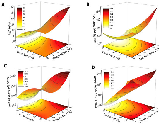 Response surfaces of SFE of bioactive compounds from propolis. Studied factors: temperature and co-solvent percentage on the (A) extraction yield, (B) TPC, (C) ABTS, and (D) DPPH. Extraction pressure 20 MPa and flow 4 mL min−1 constant in all experiments.