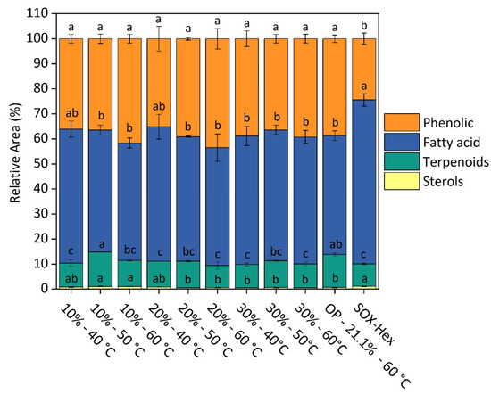 Relative abundance (%) of phenolic compounds, fatty acids, terpenoids, and sterols of SFE extracts, optimum point, and SOX-Hex determined by GC–MS. Legend: Fatty acids: sum of the relative abundance (%) of hexadecanoic acid–palmitic acid, octadecanoic acid–stearic acid, 9,12-Octadecadienoic acid–linoleic acid, alpha-linolenic acid, alpha-linolenic acid isomer, alpha-linolenic acid isomer 2, 9,12-Octadecadienoic acid isomer 2, 11-Eicosenoic acid–omega 9, pentanoic acid, pentanoic acid–valeric acid isomer, hexadecanoic acid–monopalmitin, 5-Eicosene, (E)-, octadecanoic acid–Stearic acid, tetracosanoic acid–lignoceric acid, tetracosanoic acid isomer, cis-5,8,11-eicosatrienoic acid, and decanoic acid. Terpenoids: sum of the relative abundance (%) of trans-Caryophyllene, trans-Caryophyllene isomer, phenol, 2,6-di-tert-butylphenol, alpha-Copaene, nerolidol isomer, (+) spathulenol, (−)-Caryophyllene oxide, trans–trans-farnesol, pseduosarsasapogenin-5,20-dien, trans, trans-farnesol isomer, pentitol, farnesol, myrtenol, tetrahydro linalool, and globulol. Sterols: relative abundance (%) of ergost-25-ene-3,5,6,12-tetrol). Phenolic compounds: sum of the relative abundance (%) of benzenepropanoic acid, hydrocinnamic acid, cinnamic acid, 1,3-Benzenedicarboxylic acid, and trans-Aconitic acid. OP: optimized SFE extract. Means followed by the different letters in the bars indicate a significant statistical difference by Tukey’s test (p ≤ 0.05).