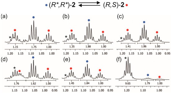 1H NMR spectra of 2 (a) and 2/Py (2/pyr (1:2) (b), 2/pyr (1:6) (c), 2/pyr (1:60) (d), 2/pic (1:6) (e), 2/DMAP (1:6) (f)), in the region corresponding to the methine protons of the Ga–CH(CH3)2 groups. (R*,R*)-2 (•) and (R,S)-2 (•) are depicted as blue and red dots, respectively. Tentative monomeric iPr2Ga(OCH(Me)CO2Me) or iPr2Ga(OCH(Me)CO2Me)(Py) species are depicted as stars (∗); the integral corresponding to the latter was estimated based on the fact that both septets corresponding to R,S-2 refer to the same number of methine protons. Abbreviations “pyr”, “pic”, and DMAP stand for pyridine, 4-methylpyridine, and 4-(dimethylamino)pyridine, respectively.