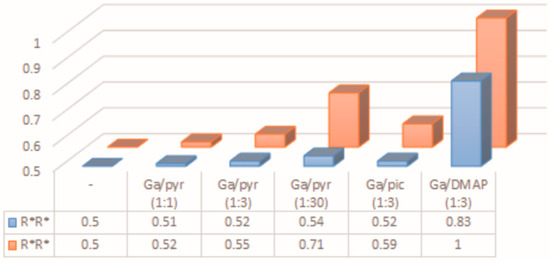 Molar fraction of homochiral species (R*,R*) for 1/Py (Py—pyridine derivative) (blue) and rac-[Me2Ga(µ-OCH(Me)CO2Me)]2/Py (orange) [1], calculated on the basis of the ratio of methylene protons and methyl protons of the Ga-Me and Ga-Et groups, respectively. Abbreviations “pyr”, “pic”, and DMAP stand for pyridine, 4-methylpyridine, and 4-(dimethylamino)pyridine, respectively.