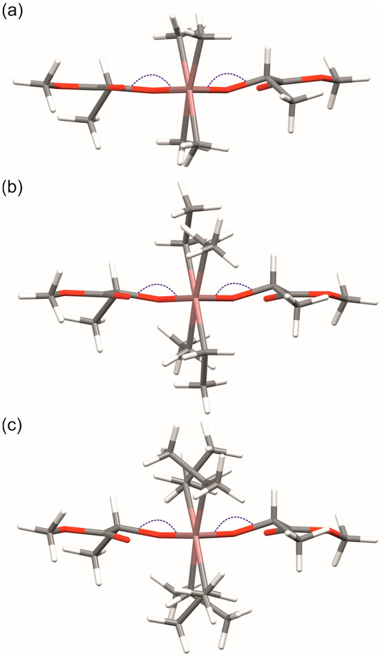 The view of the molecular structures of (S,S)-[R2Ga(µ-OCH(Me)CO2Me]2 (R = Me (a), Et (b), and iPr (c)) along the Ga-Ga axis. Different Ga–O–Ga–CH(Me) torsion angles (deg) are indicated by the dashed blue arches for the following: (S,S)-[Me2Ga(µ-OCH(Me)CO2Me]2 (−156.7 and −171.7), (S,S)-1 (−157.3 and −163.7), and (S,S)-2 (−168.3 and −161.8). Gallium and oxygen atoms are depicted as brown and red, respectively.