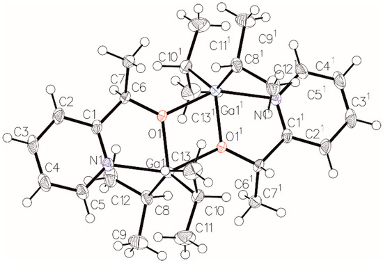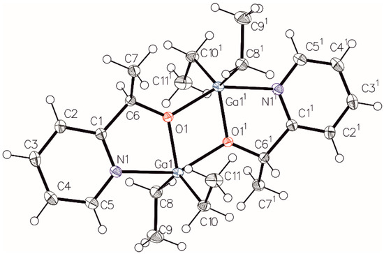 Complexes 3 and 4 were characterized in the solid state by X-ray diffraction analysis, which revealed, in both cases, the presence of centrosymmetric heterochiral dimers (R,S)-[R2Ga(µ-OCH(Me)C5H4N]2 (Figure 7 and Figure 8). This was in sharp contrast to the analogous dimethyl derivatives, which led upon crystallization solely to the (R*,R*)-[Me2Ga(µ-OCH(Me)C5H4N]2 of the C2 symmetry [1]. However, the observed structure of 3 and 4 was in line with the effect of the ethyl and iso-propyl groups on the tendency for the formation of centrosymmetric dialkylgallium alkoxide species, as shown above for the [R2Ga(µ-OCH(Me)CO2Me]2 complexes. In the case of 3 and 4, five-coordinate gallium atoms adopted a distorted trigonal-bipyramidal geometry. Carbon atoms of gallium-bonded alkyl groups and the alkoxide oxygen of the OCH(Me)C5H4N ligand defined the equatorial plane. The nitrogen of the pyridine functionality of the OCH(Me)C5H4N ligand and a bridging alkoxide oxygen atom of the second monomeric unit were located in the axial positions. Notably, the presence of ethyl, and especially iso-propyl groups, did not essentially restrain the formation of Ga–N bonds to the fifth coordinate site of gallium in comparison to the analogous dimethyl derivative. This was demonstrated by the Ga–N distances for the following [R2Ga(µ-OCH2C5H4N)]2 complexes: 2.2789(18) Å (R = Me), 2.2908(11) Å (R = Et; 3), and 2.2759(18) Å (R = iPr; 4). On the other hand, the presence of a iPr group resulted in the elongation of the bridging Ga–O′ bond (2.1632(13) Å) within central Ga2O2 ring in comparison to the analogous bond in (R*,R*)-[Me2Ga(µ-OCH(Me)C5H4N)]2 (2.0931 Å), as well as in 3 (2.0906(8) Å).