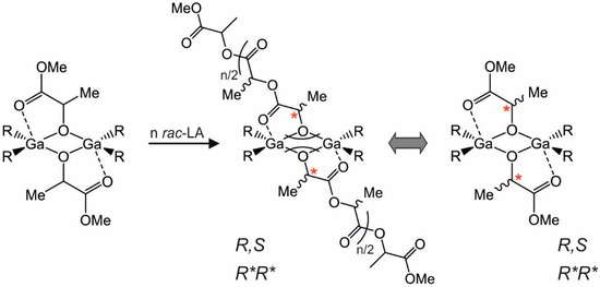 The structure of propagating species—[R2Ga(µ-OCH(Me)CO2PLA)]2—in the ROP of rac-LA with dialkylgallium alkoxides, modeled by the dialkylgallium methyl lactate derivatives. Red stars indicate chiral centers which lead to the formation of either homochiral or heterochiral species. In our study, the homochiral (R*,R*) species are modeled by (S,S)-[R2Ga(µ-OCH(Me)CO2Me]2; the heterochiral (R,S) species by (R,S)-[R2Ga(µ-OCH(Me)CO2Me]2.